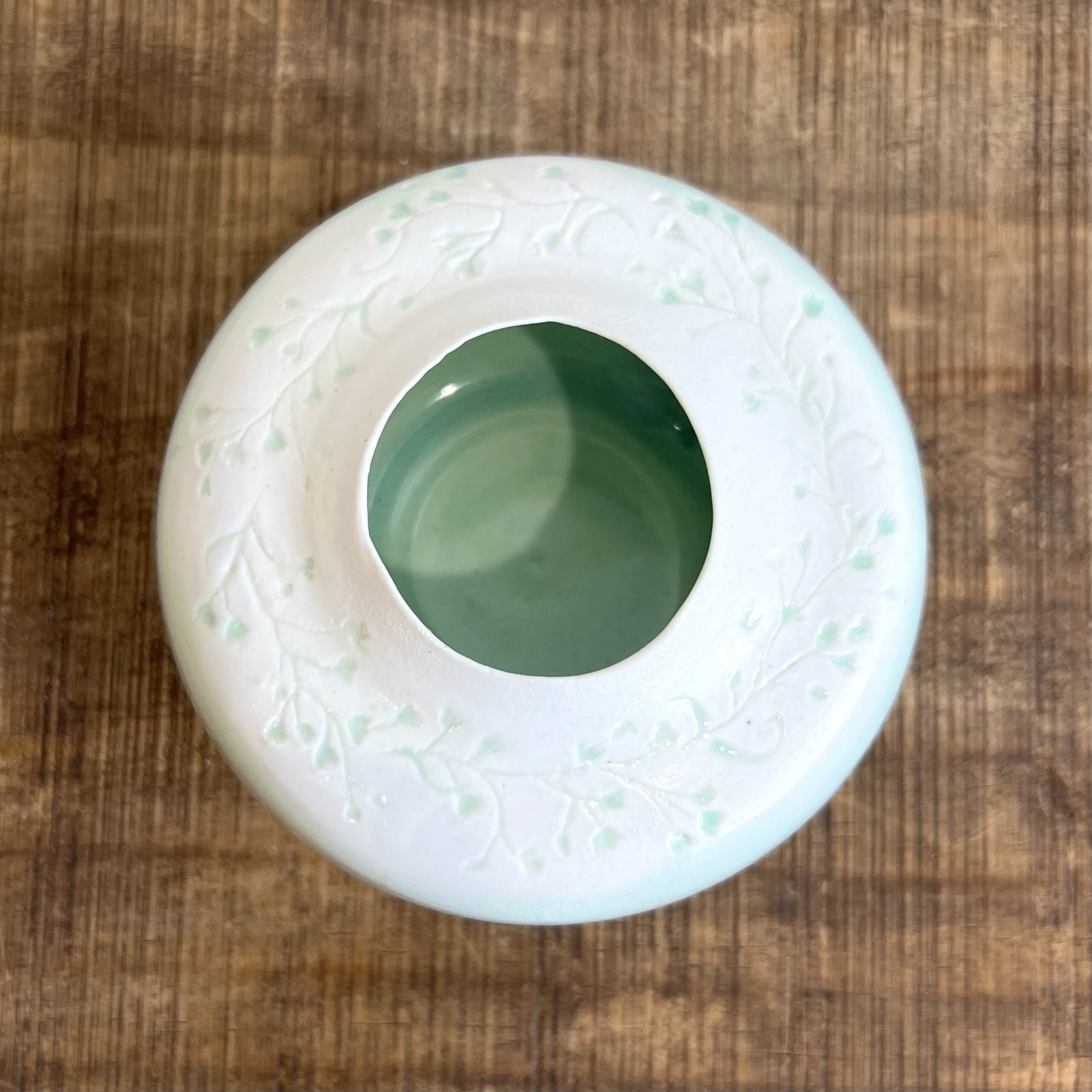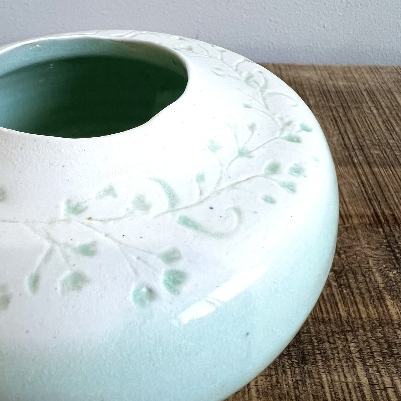 Beautiful wheel thrown vase with an organic edged rim and a softly gradiated pale turquoise glaze.